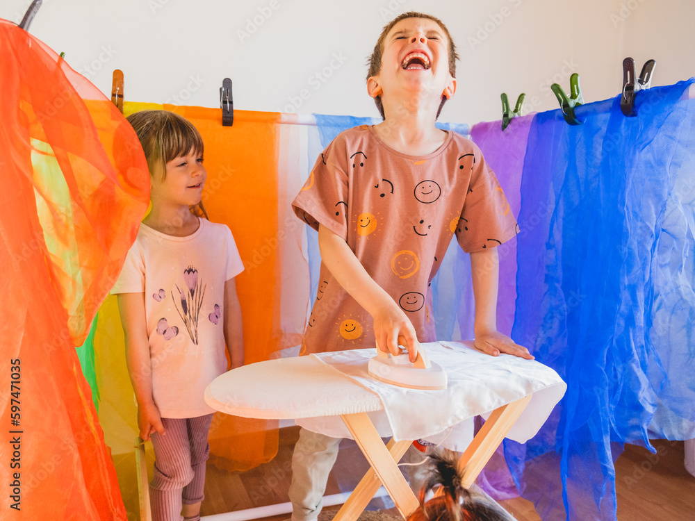 niños jugando a juego de roles dentro de cubo #597471035