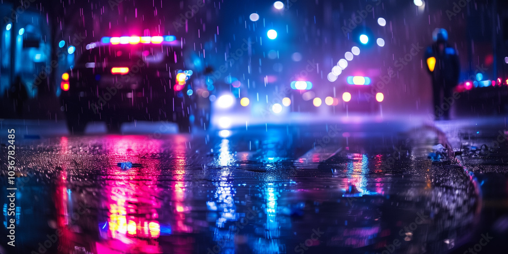 Night time abstracted blurred view of police lights. accident Police investigate night crime scene in the rain with flashing lights ground view #1036782485