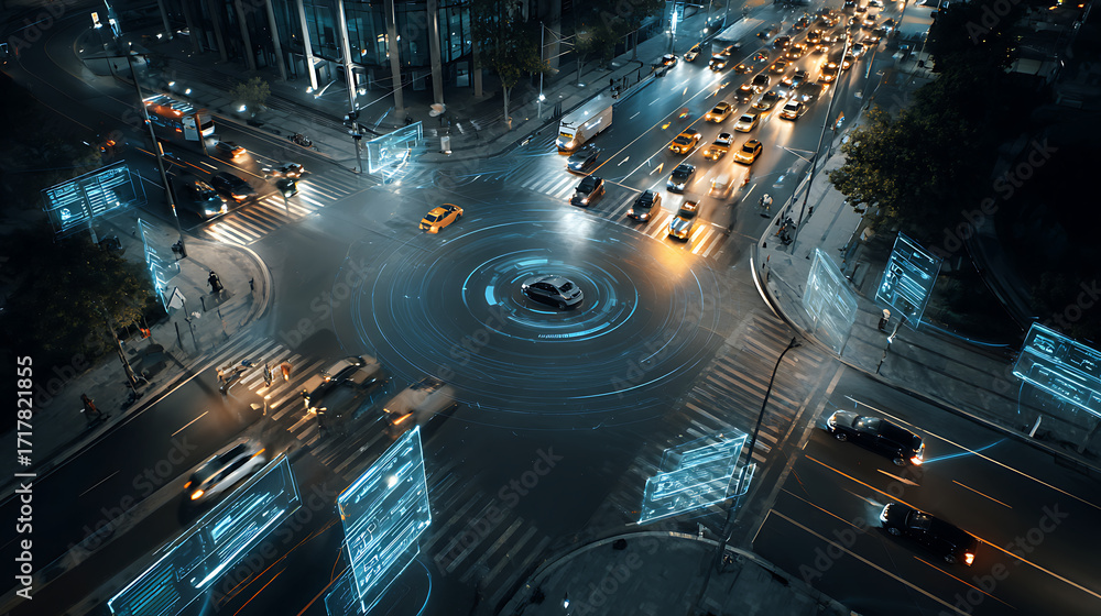Nighttime city intersection with autonomous vehicles and digital interface overlays #1717821855