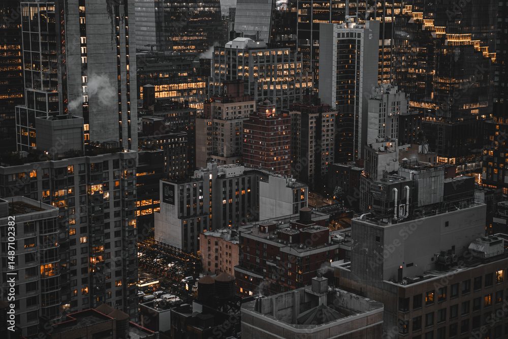 Nighttime New York City Skyline With Bright Urban Lights Across Tall Buildings and Rooftops #1487102382