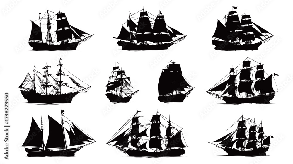 Nine detailed illustrations showcase vintage sailing ships of different designs. Each ship displays unique rigging and sails, emphasizing maritime history and art. #1736273550