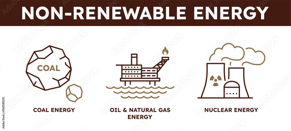 Non-renewable energy infographic concept. Vector line art icons of coal, offshore oil and natural gas rig, and nuclear power plant. Fossil fuel and industrial power generation. #1969580595