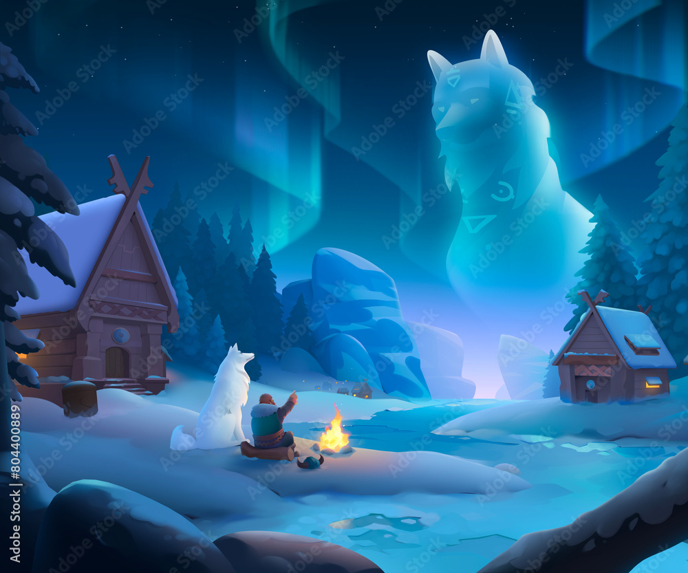 Norse Mythology, Viking with Wolf Looking at Northern Lights, Game Art Illustration Background, Cover #804400889