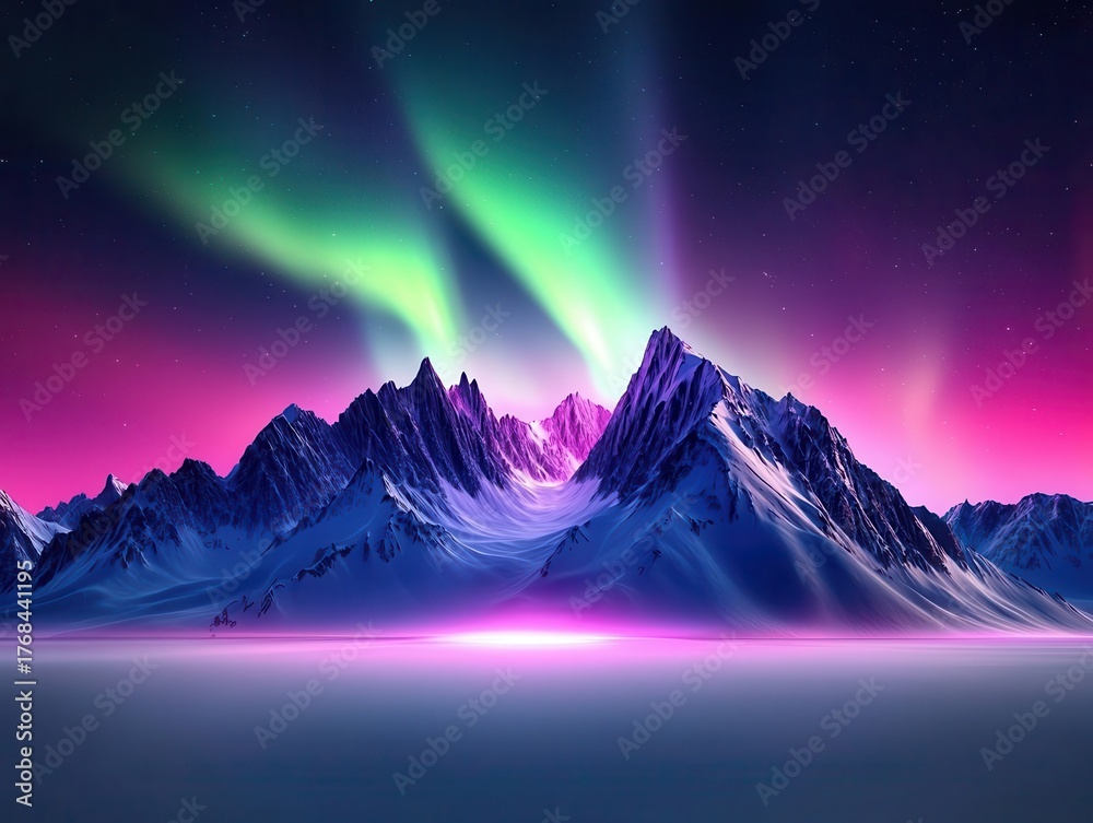 Northern lights above mountain range with glowing peaks, dramatic contrast #1768441195