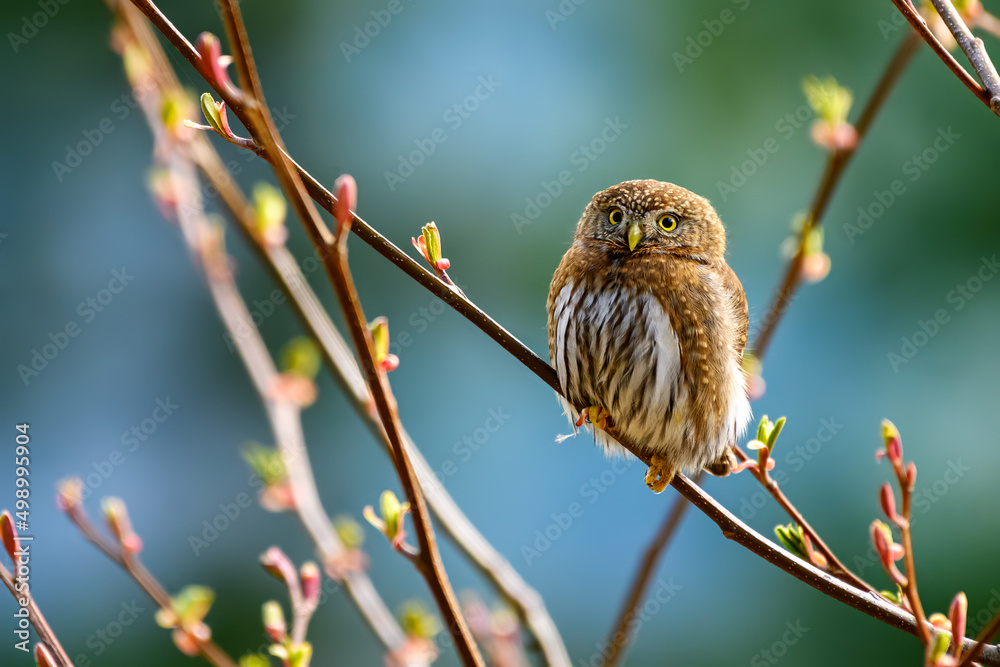 Northern pygmy owl (Glaucidium californicum) perching on a branch in British Columbia #498995904
