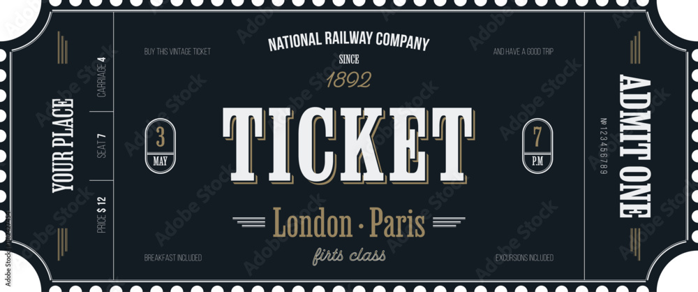 Nostalgic vintage ticket template on a dark background with golden accents. For excursion routes, retro parties, clubs and other projects. Just add your text.Vector, printable. #1182427454