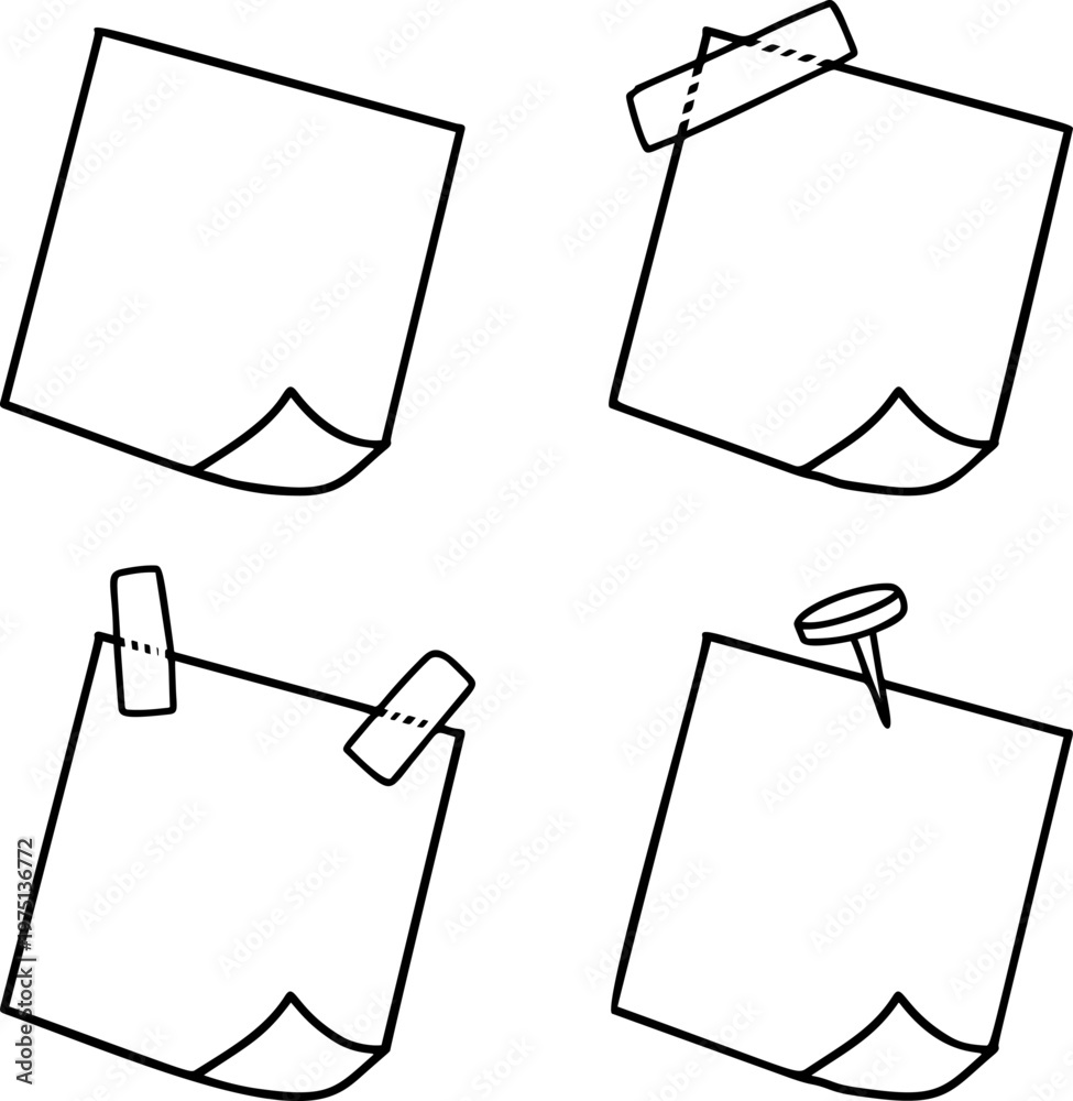 Note paper set, sticky memo page sticker doodle line art. Blank message reminder with tape and pin, office post note board, notice paper element black outline. Sticky note collection #1975136772