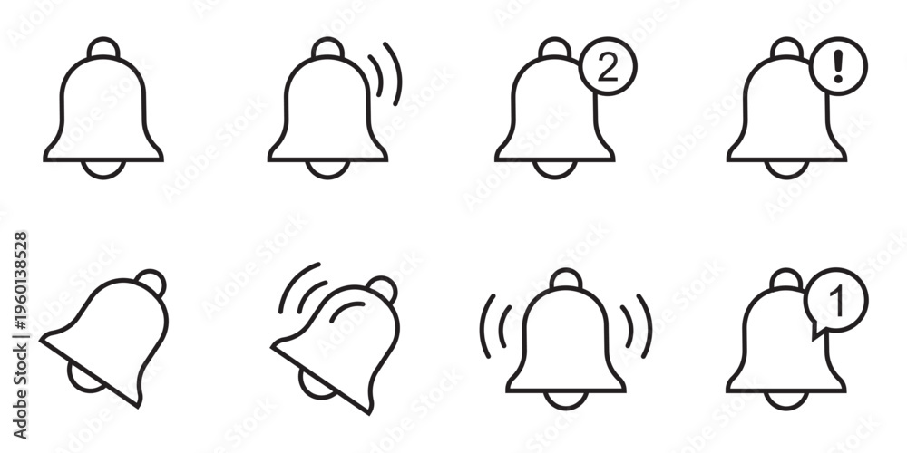 Notification bell icon set. Ringing notification bell icons, alarm and smartphone alert symbols, new message and reminder illustrations, shaking bell to notify, vector set, modern notification. #1960138528