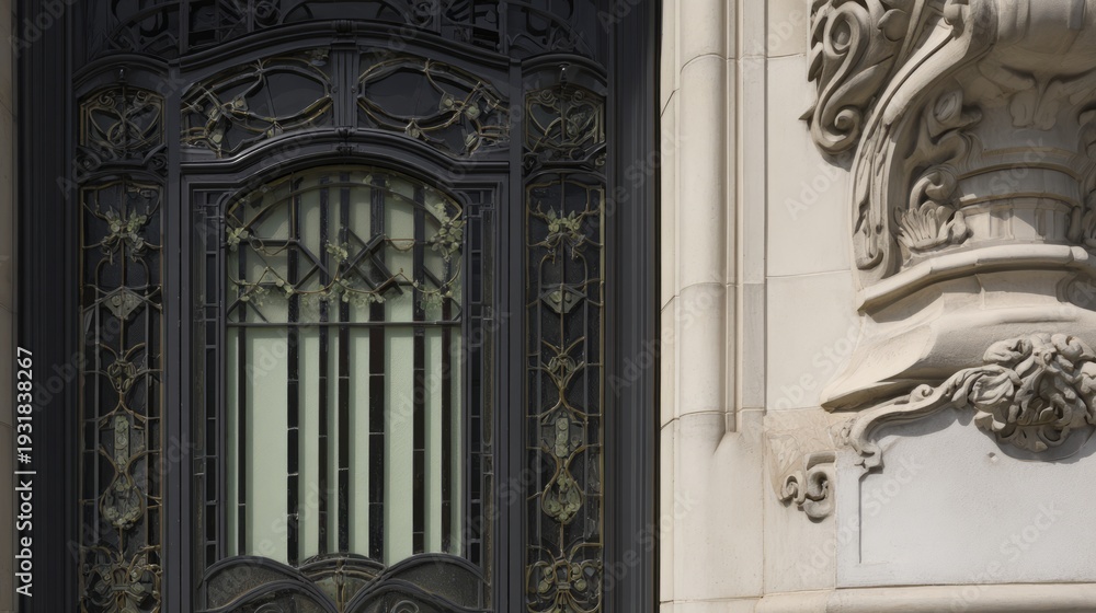 nouveau. An Art Nouveau style door with geometric and floral motifs next to ornate Baroque architecture. real-estate listings. #1931838267