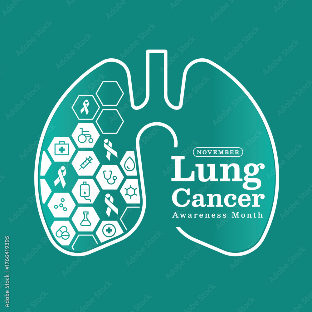November, Lung cancer awareness month - White line lung with medical hexagon icon and white ribbons on green background vector design #1766419395