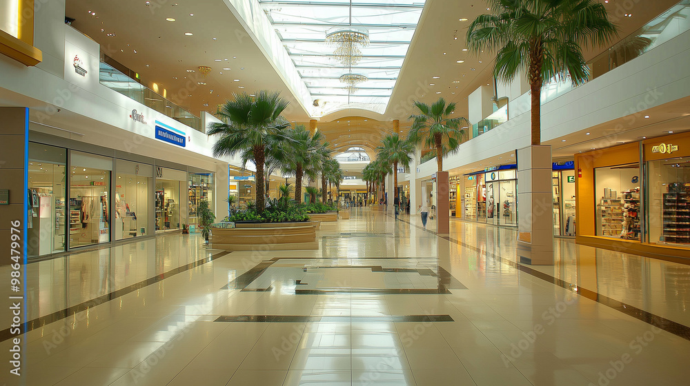 Nowoczesne centrum handlowe z jasnymi, przestronnymi korytarzami, stylowymi sklepami i relaksującymi strefami odpoczynku. #986479976