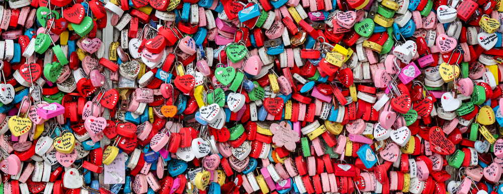 Numerous colorful love locks symbolizing romance and commitment covering a fence in Namsan Park #1764627565