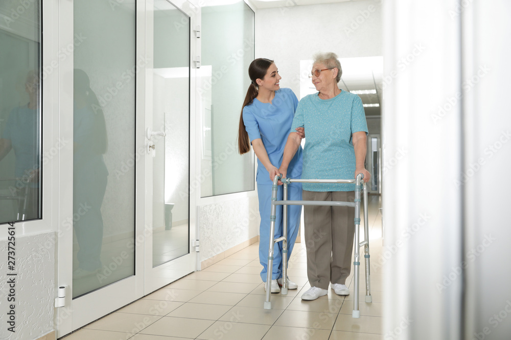 Nurse assisting senior patient with walker in hospital hallway #273725614
