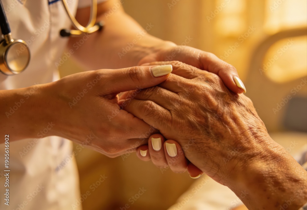 Nurse consoling senior woman holding her hand senior, nurse, holding, pensioner, holding hands, hand, woman #1905616902