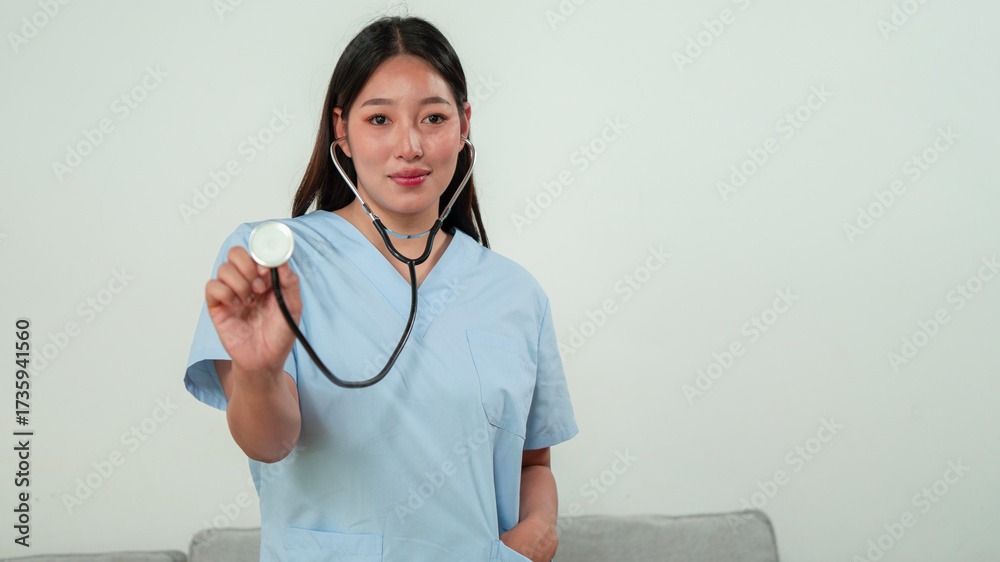 Nurse demonstrating stethoscope use in healthcare setting educational image professional environment close-up view #1735941560
