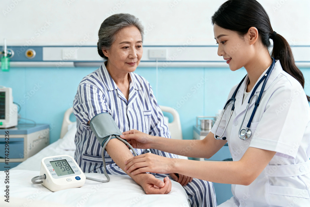 Nurse taking patient's blood pressure: Healthcare, Medical Training, Pharmaceuticals, Insurance #1742296236