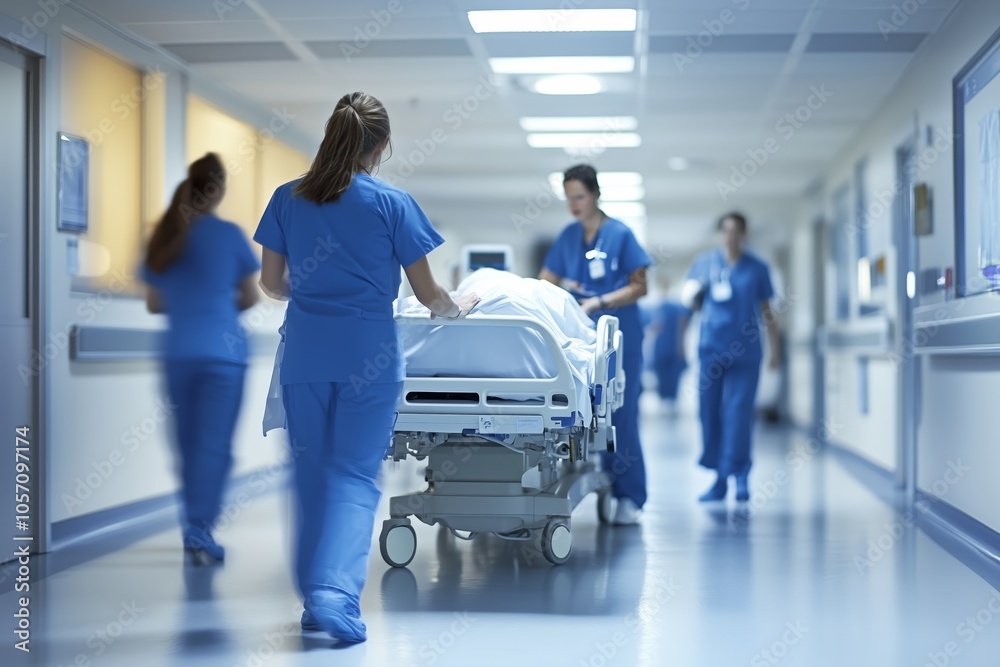 Nurses pushing a gurney with a patient along a hospital corridor, demonstrating teamwork and patient care #1057097174