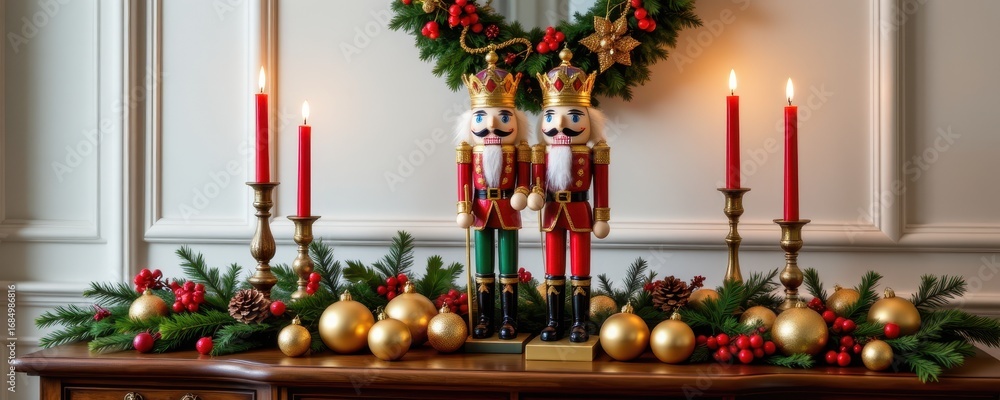 nutcracker standing among golden ornaments red candles and pine garlands on a sideboard creating a luxurious christmas decoration #1684986816