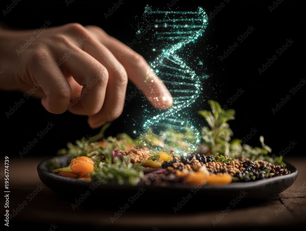 Nutrigenomics and personalized nutrition showing a hand touching a digital DNA helix above a salad representing the concept of precision diet and genetic testing for optimal health and wellness. #1956774739