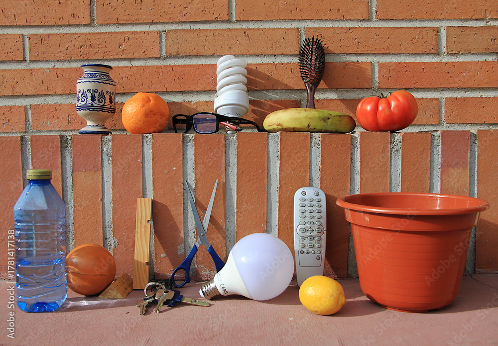Objetos, comida y grupo de cosas diferentes apoyadas en ladrillo #1781417138