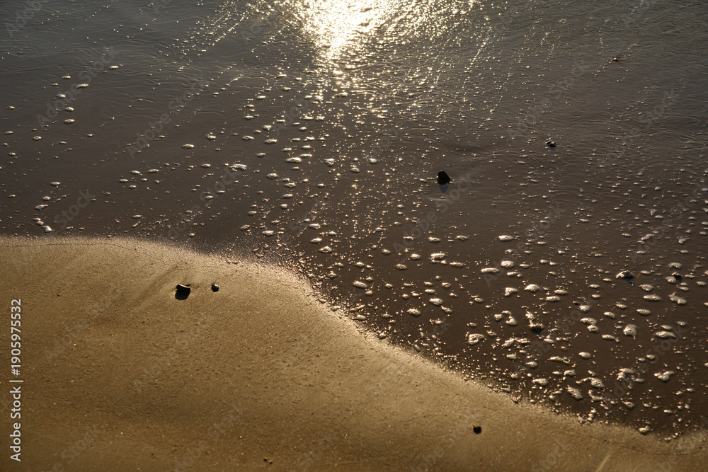 Ocean wave reaching sandy beach with sun glitter #1905975532