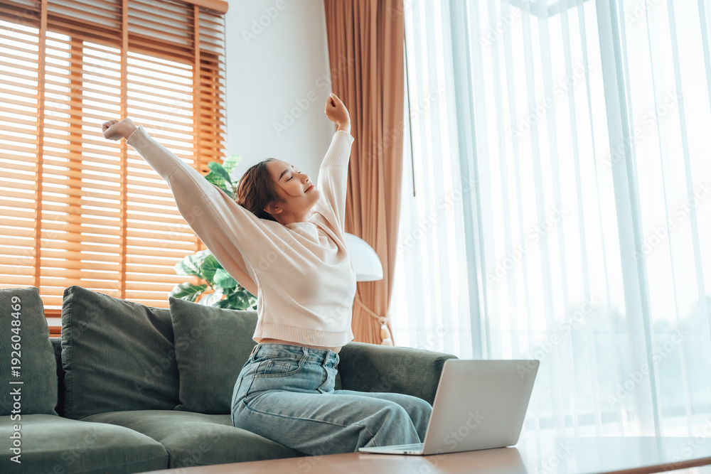 Office syndrome concept. Young asian woman feeling pain in neck and shoulder after working on computer laptop for a long time. She stretches to relax her muscles #1926048469