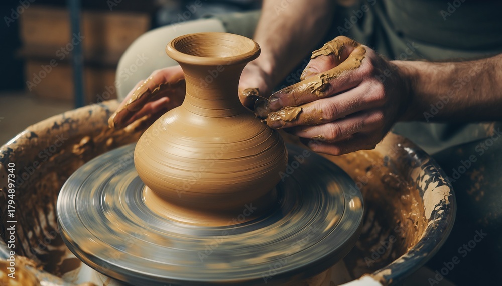 Oficio de alfarería. Primer plano de manos de alfarero creando una gran vasija de arcilla sobre un torno giratorio tradicional. Luz de estudio profesional #1794897340