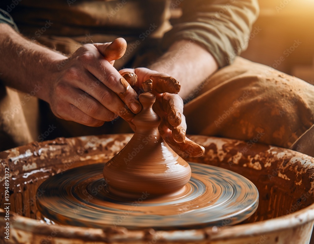Oficio de alfarería. Primer plano de manos de alfarero creando una gran vasija de arcilla sobre un torno giratorio tradicional. Luz de estudio profesional #1794897372