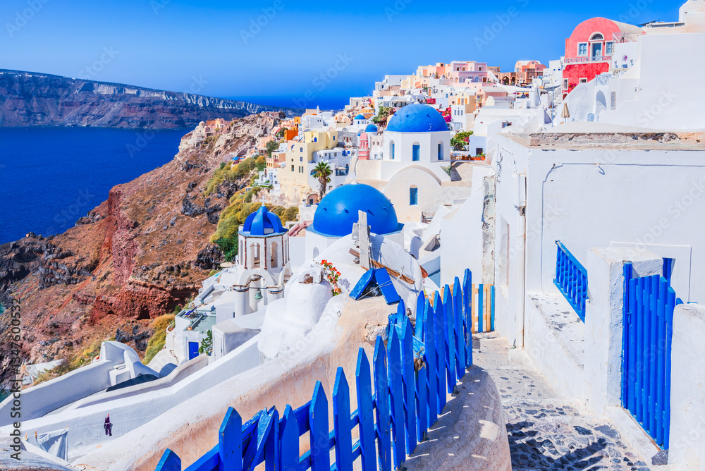Oia, Santorini. Beautiful village with whitewashed houses, blue-domed churches and caldera views overlooking the Aegean Sea, Greece. #1347600532