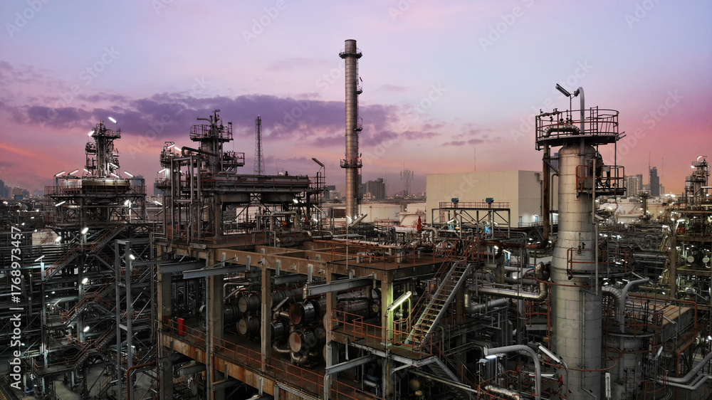 Oil and gas industry - refinery factory zone, The equipment of oil refining,Close-up of industrial pipelines of an oil-refinery petrochemical plant at sunset #1768973457