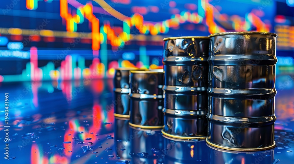 Oil barrels and stock market chart illustrating the surge in oil prices in financial context #1940431961