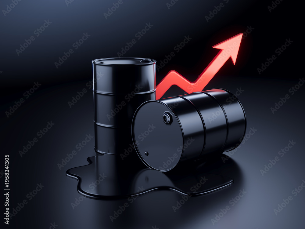 Oil Barrels Drum and arrow up - Concept of rising oil prices. 3d illustration #1958241305