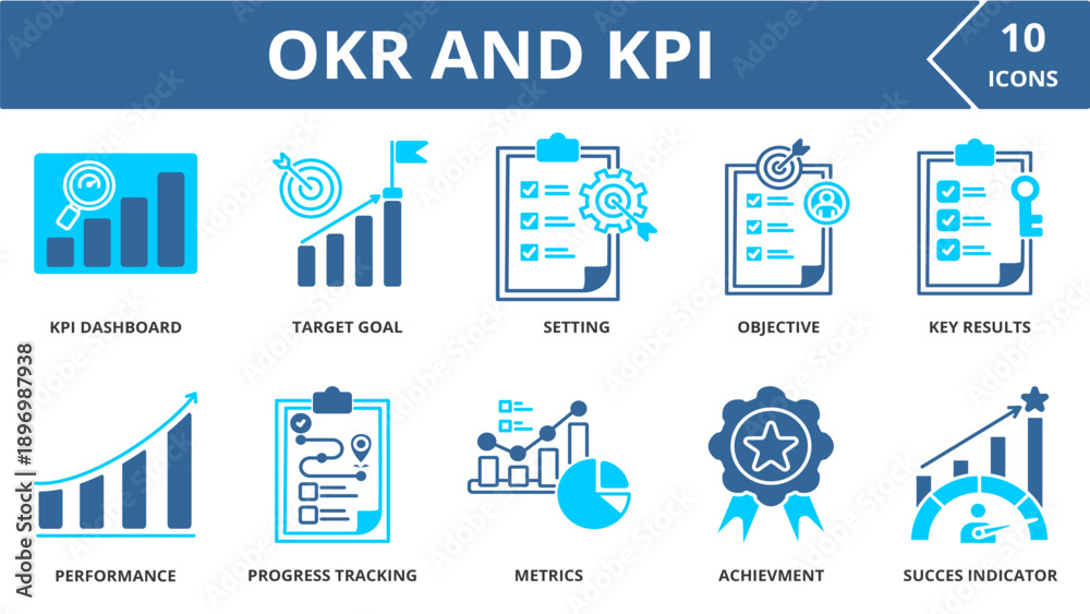 OKR AND KPI icon collection set. Containing KPI dashboard, Target, Goal setting,Objective, Key results, Performance chart Progress tracking, Metrics .dual tone vector. #1896987938