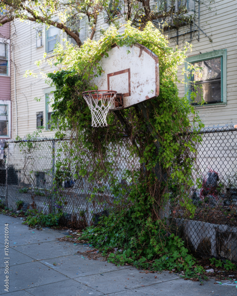 Old basketball hoop covered with green vines and leaves on chain link fence in urban neighborhood with houses in background #1762901094