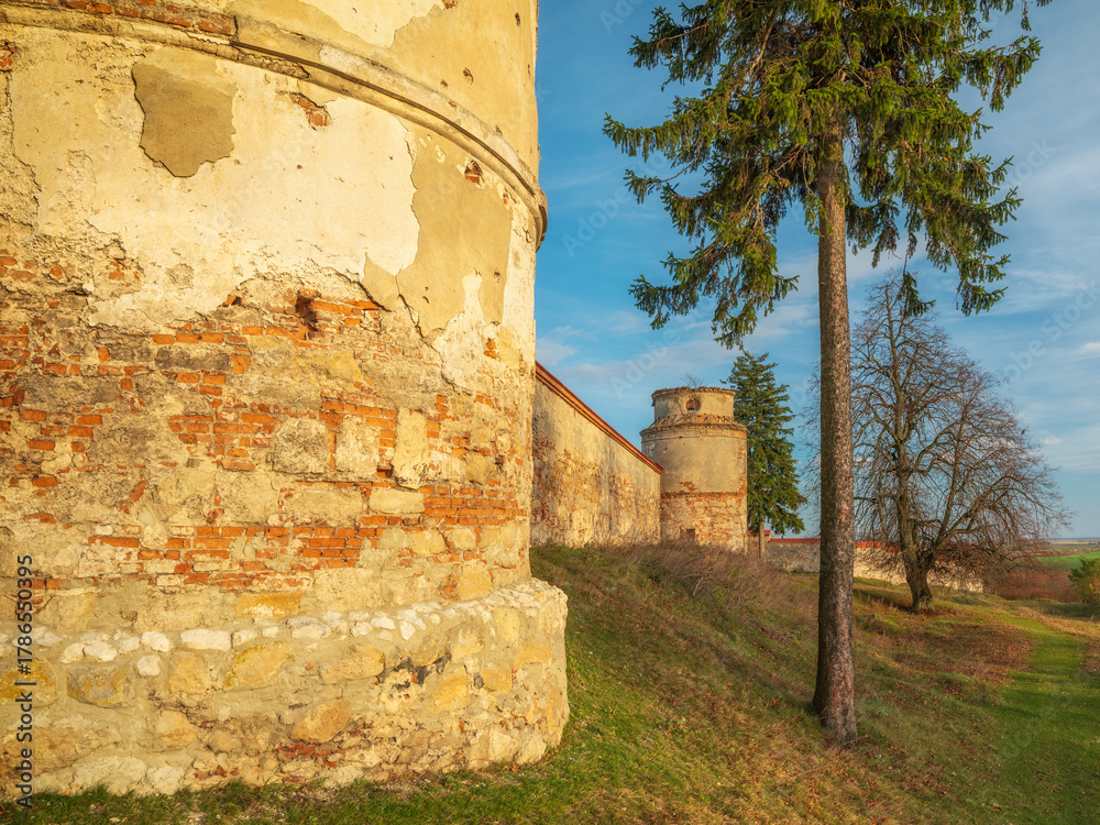 old castle walls and towers in sun light with pines #1786550395