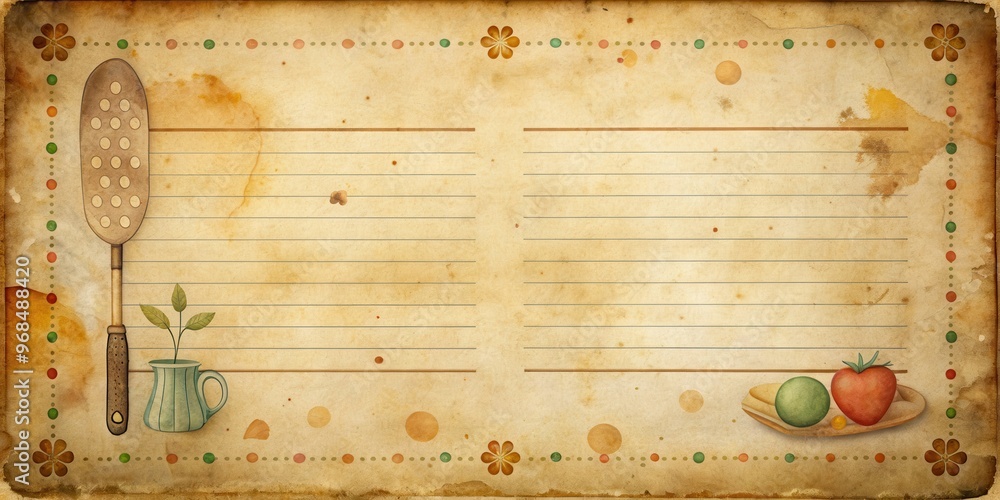 Old grunge retro recipe card with vintage fonts, stains, and faded colors, nostalgic, food, vintage, grunge, retro, recipe #968488420