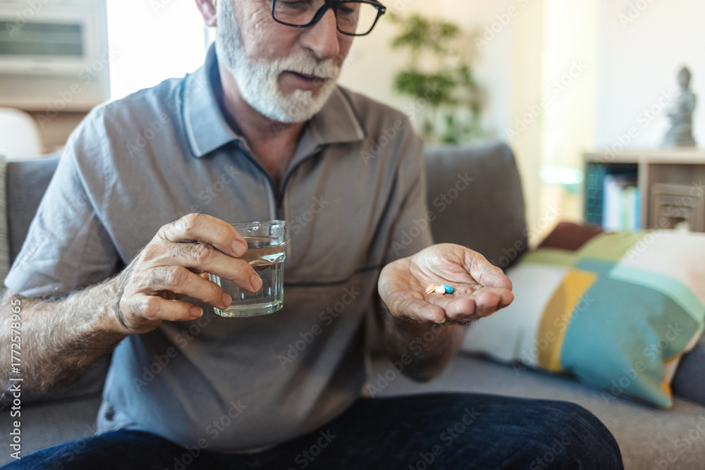 Old man, hands and tablet container in home, arthritis treatment and water for antibiotics or drugs. Male person, healthcare and pharmaceutical organizer on table, pills and medication for joint pain. #1772578965