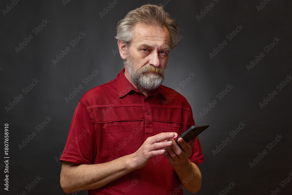 Old man over 60 portrait in studio with smartphone on black background #1807658910