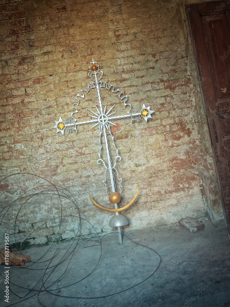 old silver cross linen to brick wall of old church #1788719587