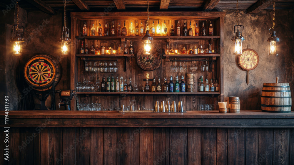 Old tavern, vintage pub with wooden bar counter, shelf with bottles, glow lanterns and beer mug on table. Vector cartoon empty interior of retro saloon with barrel and darts target at night #1194511730