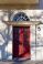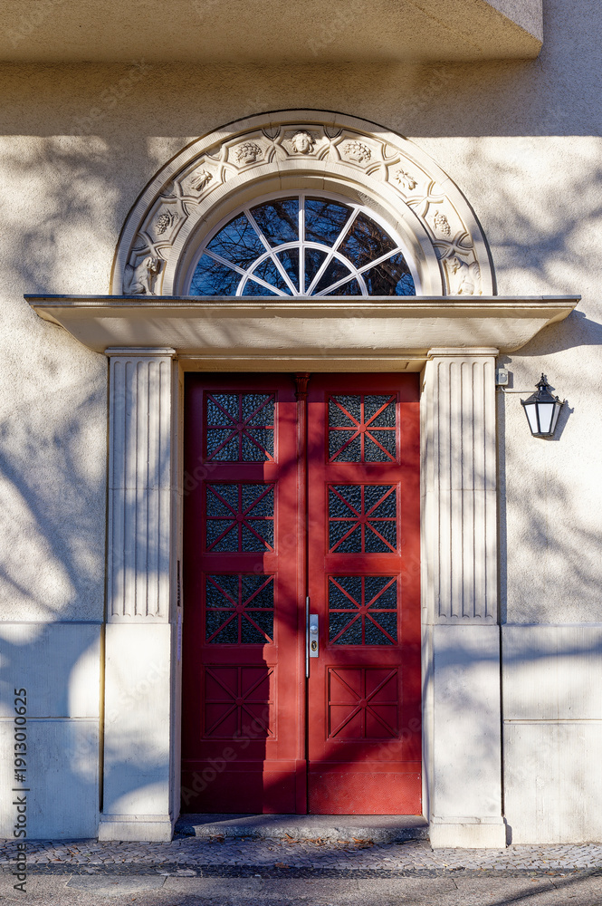 Old wooden door with window above it featuring decorative elements in the historic district of Rixdorf in Berlin. #1913010625