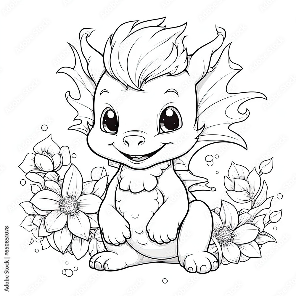 ?oloring page for kids, A cute baby dragon, flowers, white background #650851078