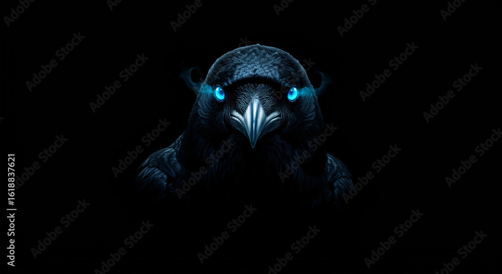 Ominous raven with glowing eyes digital art for dark fantasy illustration and wallpaper design element on dark background #1618837621