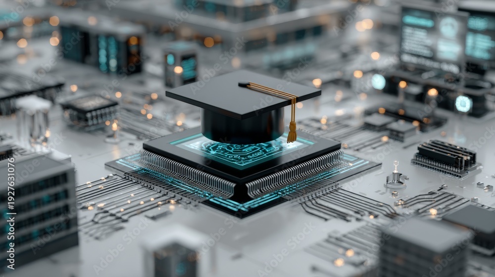 On a digital tablet, a graduation cap and diploma appear with cybersecurity shield icons, representing a Master of Science in cybersecurity and digital security know‑how #1927631076