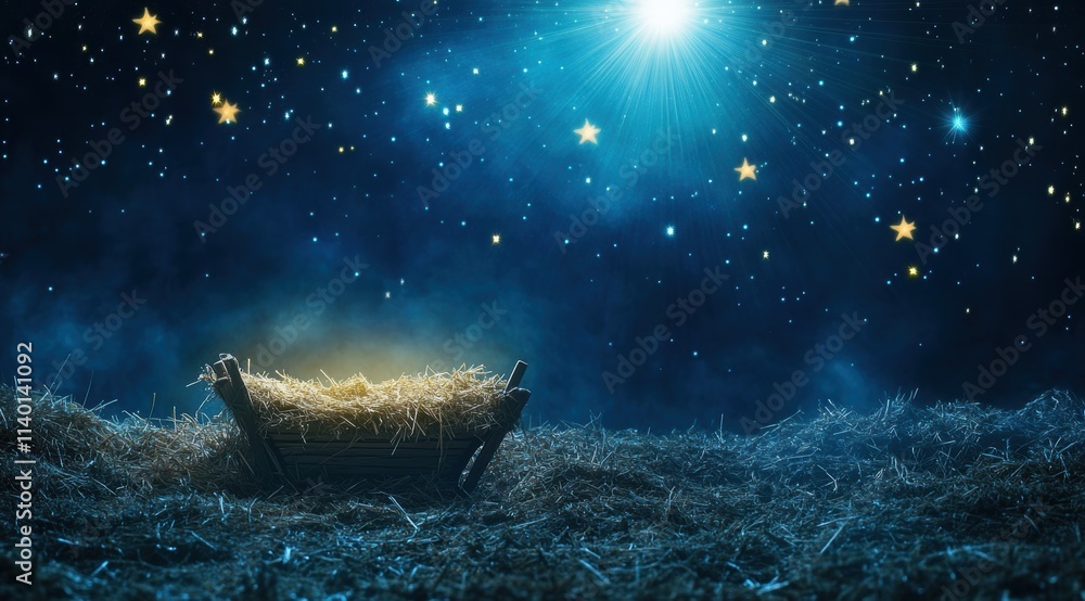 On the night of Jesus' birth, a manger filled with hay and an empty cradle stood in fronе #1140141092