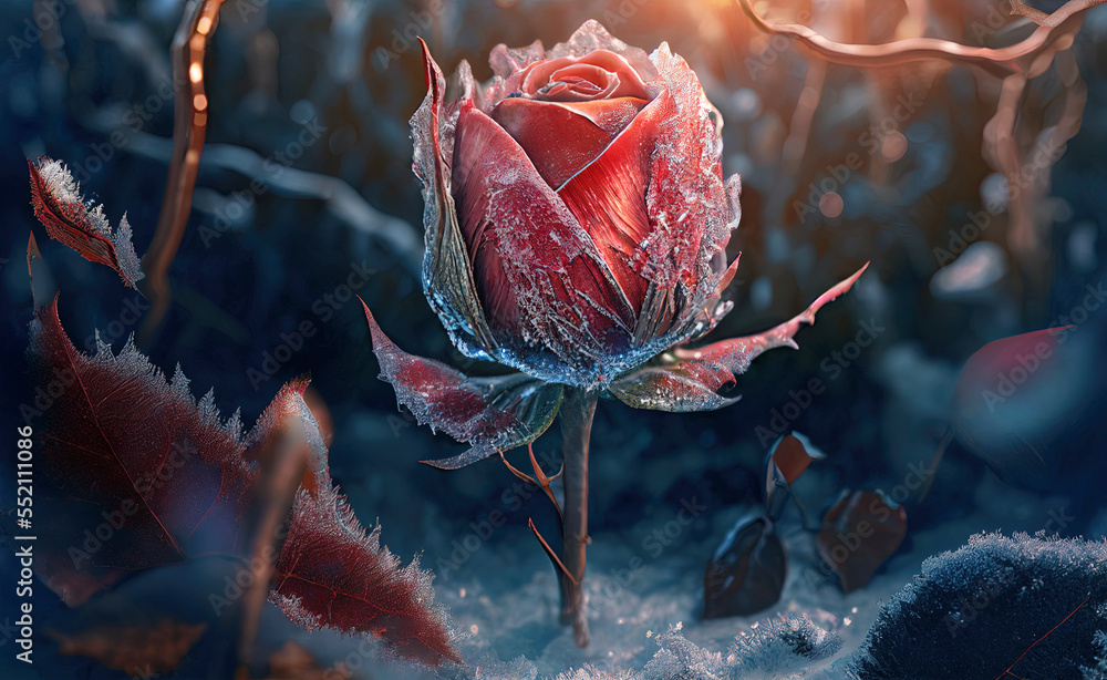 One frozen red rose hidden in cold grass. Postproducted generative AI digital illustration. #552111086