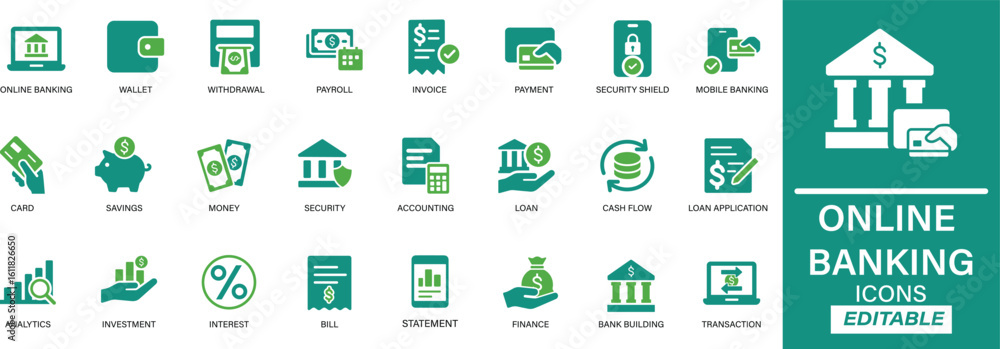 Online banking icon set in clean line style. Includes icons for mobile banking, transactions, accounts, digital payments, and security. Ideal for fintech apps, finance dashboards, and banking tools.#1611826650