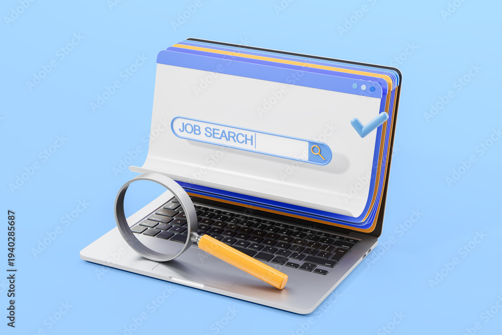 Online job search concept with laptop screen, magnifying glass, and search bar illustration on light blue background.. 3D Rendering #1940285687