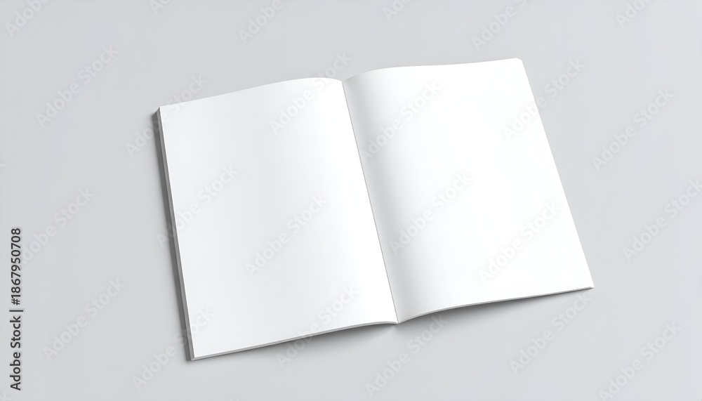 Open blank magazine with crisp white pages, centered on a light gray surface #1867950708