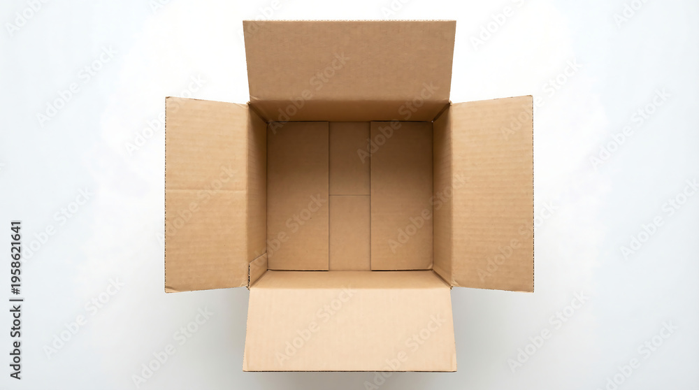 Open Cardboard Box: An empty open cardboard box, viewed from a top-down perspective, showcasing its neat construction and spacious interior, implying potential for packaging and shipping. #1958621641
